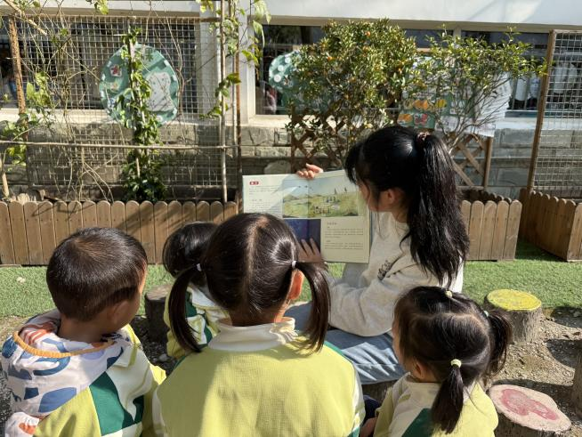 绿荫为伴,微风作陪,小二班的故事会搬到户外。老师讲述《春分的故事》,孩子们围坐倾听,眼中满是好奇。故事结束后,他们翻开春日绘本,在鸟语花香中,享受阅读的美好时光。